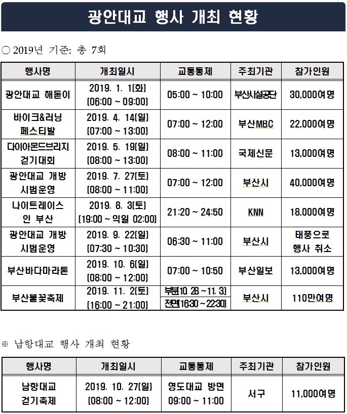 첫째, 민간주최 행사를 통합개최 또는 두 분류로 나누어 격년으로 개최하는 방안을 제안하면서 광안대교 전면 통제 행사를 최소한으로 줄여 줄 것.