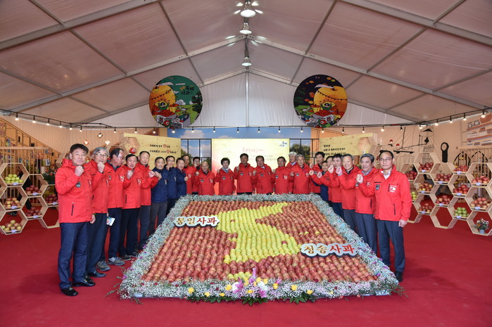 ▲ 사과축제 성공을 위한 군청간부들 화이팅