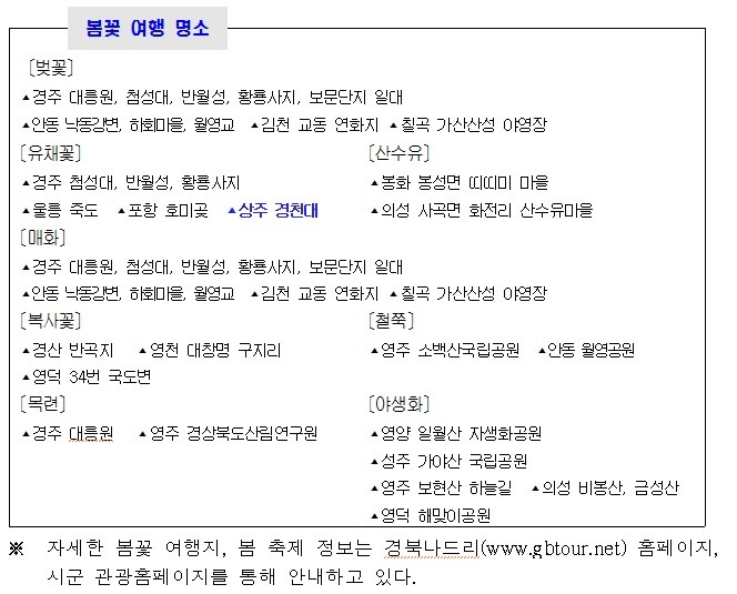 한만수 경북도 문화관광체육국장은 “당장 다음 주면 시작하는 경북의 특별한 봄꽃 여행지에서 가족과 함께 오랜 기억에 남는 추억을 가득 담아 가시길 바란다”고 말했다.