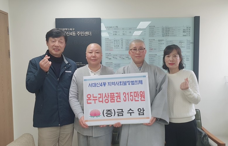 [서구 세계타임즈=이용우 기자] 부산 서구 금수암(주지 지관스님)은 27일 서대신4동(동장 정현조)에 온누리 상품권(315만 원 상당)을 전달하였다.