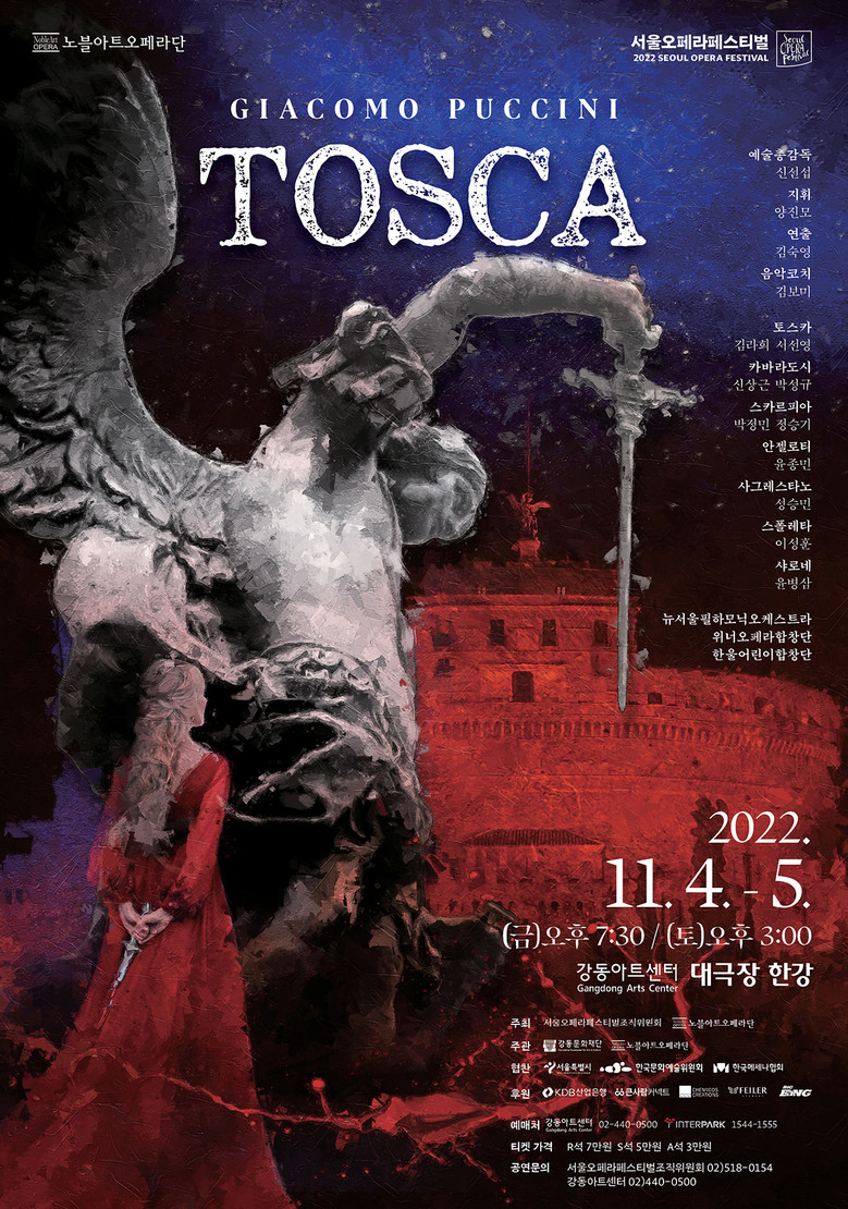 ‘예술에 살고, 사랑에 살고 (Vissi d’arte, vissi d’amor)‘, ’별은 빛나건만 (E lucevan le stelle)‘ 등 유명 아리아를 통해 느끼는 비극적인 사랑 이야기는 관객의 가슴을 울리는 작품이 될 것이다. 더욱이 대한민국을 대표하는 제작진과 출연진으로 구성되어 수준 높은 무대를 기대해도 좋다. 총예술감독 신선섭을 필두로 지휘 양진모, 연출 김숙영, 토스카 역에 소프라노 서선영, 김라희 카바라도시 역에 신상근, 박성규, 스카르피아역에 정승기, 박정민 등이 수준 높은 무대를 제공한다.