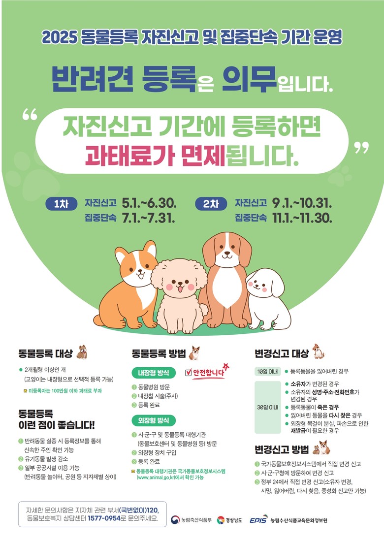 박동서 경남도 축산과장은 “동물등록은 반려인의 의무 사항일 뿐만 아니라, 유기·유실견 발생을 방지하고 반려문화 정착을 유도하는 데 중추적인 역할을 한다”라며, “자진신고 기간 내 반려견 소유자의 자발적인 참여를 당부드린다”고 말했다.