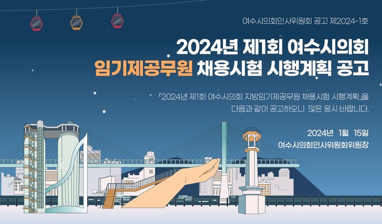 이번 채용시험 관련 자세한 내용은 여수시의회 홈페이지(https://council.yeosu.go.kr)에서 공고문을 확인하거나 의회사무국 총무팀(☎061-659-5022)으로 문의하면 된다.