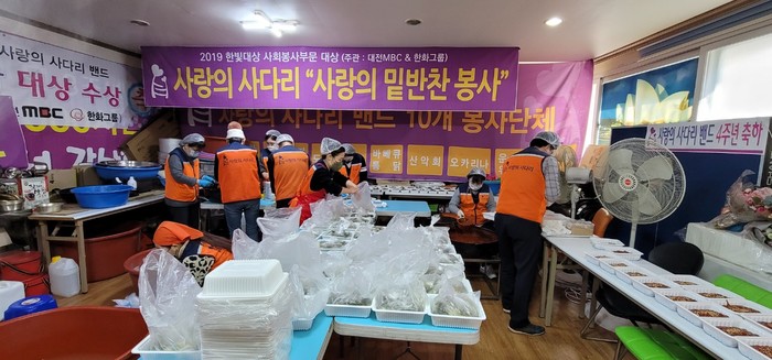 [대전=세계타임즈 이채봉 기자] 6년째 꾸준히 대전시 소외계층을 위해서 다양한 봉사를 펼치고 있는 대전시 봉사단체 사랑의 사다리 밴드(리더 이정제)는 14일 오전9시~오후12시에 밑반찬 3가지를 만들어서 서구지역 소외계층 60가정에 전달을 하였다.