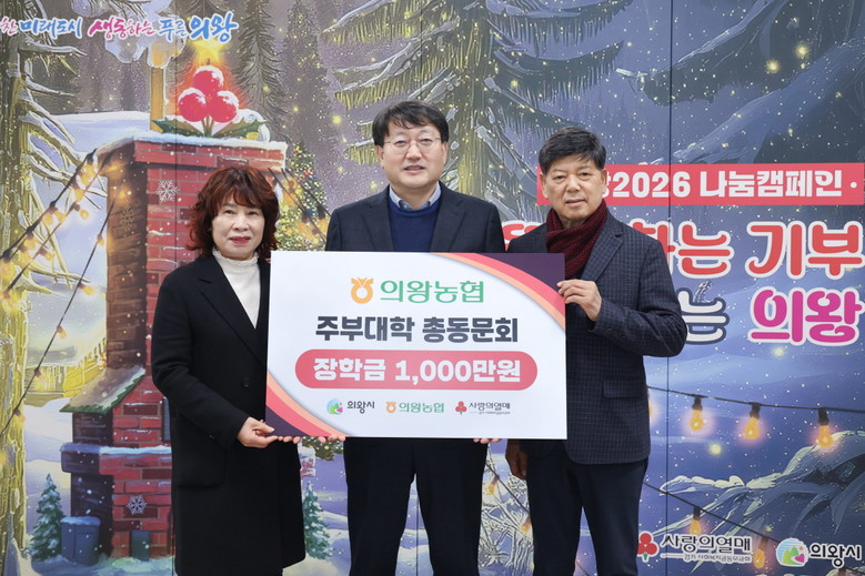 [의왕시 세계타임즈=송민수 기자] 의왕시는 12월 18일 ‘의왕농협주부대학 총동문회(총회장 김경자)가 지역 인재 육성을 위해 장학금 1,000만원을 기부했다고 밝혔다.