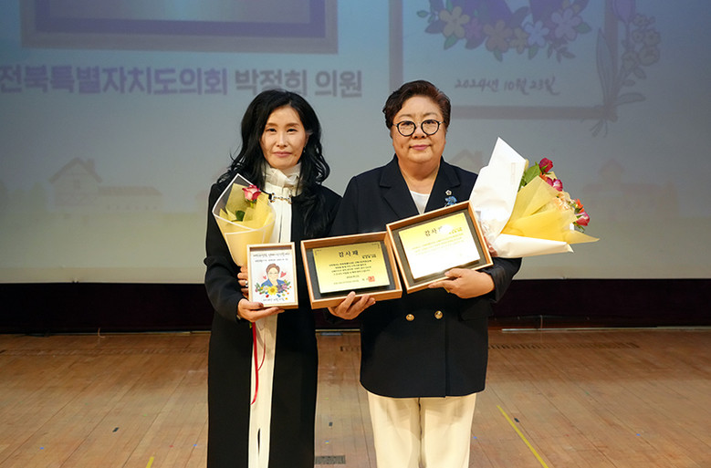 [전북특별자치도의회=세계타임즈 이상호 기자] 전북특별자치도의회 박정희 의원(군산3)은 23일 제5회 전북 선배시민 대회에서 그동안의 헌신적인 의정 활동과 노인복지 발전에 기여한 공로를 인정받아 감사패를 수여받았다.