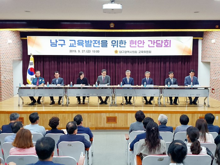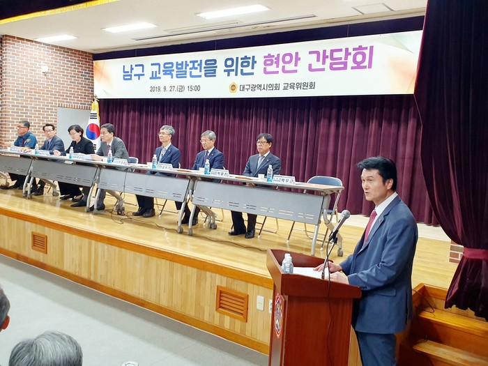 [대구=세계타임즈 한성국 기자] 대구광역시의회 교육위원회(위원장 박우근)는 9월 27일 오후 3시 대구영선초등학교 시청각실에서 남구 지역 32개교 학교장, 학교운영위원 및 학부모 등을 초청해 현장의 목소리를 청취하고, 교육현안 문제 해결 및 의정활동 반영을 위한 간담회를 개최하였다.