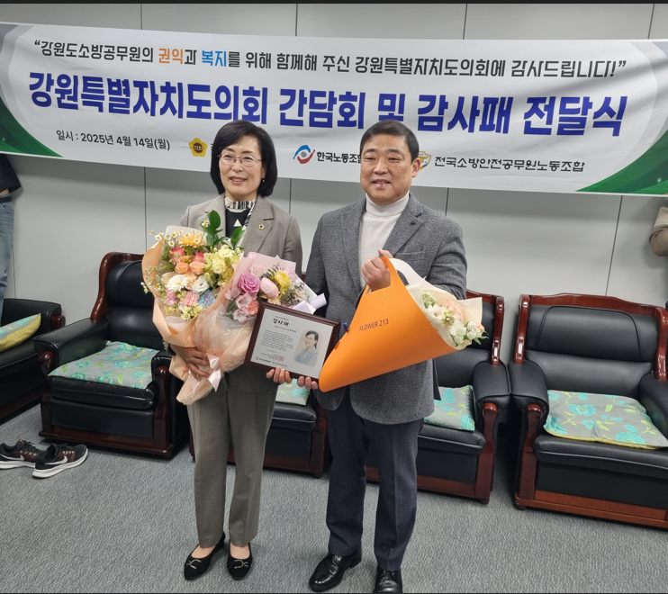 [강원도 세계타임즈=김민석 기자] 양숙희 강원특별자치도의원(안전건설위, 춘천6)은 4월 14일(월), 강원특별자치도의회에서 한국노총 전국소방안전공무원노동조합(위원장 홍순탁)이 수여하는 감사패를 받았다.