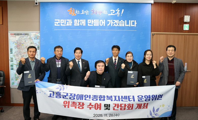 [고흥군 세계타임즈=우덕현 기자] 고흥군(군수 공영민)은 지난 26일 고흥군장애인종합복지센터 운영위원에게 위촉장을 수여하고, 센터 운영 방향 설정과 주요 사업 심의를 담당할 운영위원회를 공식 출범시켰다.