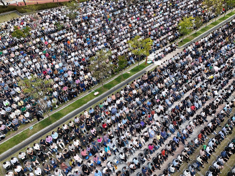 | ▲ 지난 27일 신천지예수교 청주교회에서 ‘계시록 성취 실상 증거 신천지 말씀대성회’가 열린 가운데 야외에서도 시민들이 이만희 총회장의 강의를 듣고 있다. [사진 제공 = 신천지예수교회] |