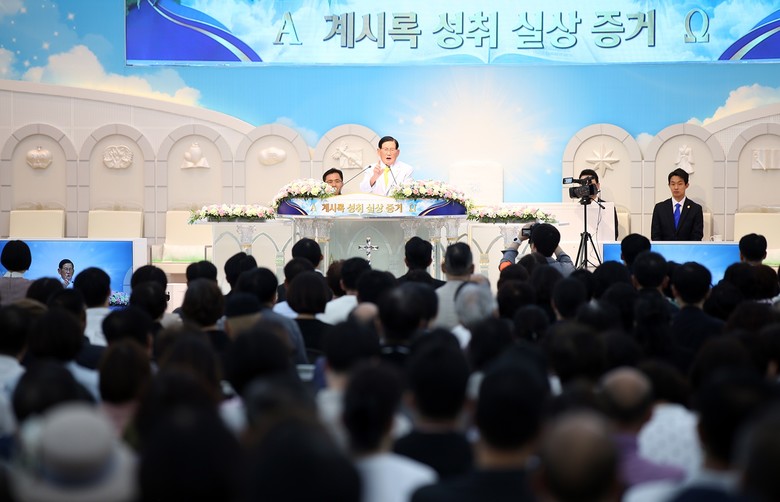 | ▲ 지난 27일 신천지예수교 청주교회에서 열린 ‘계시록 성취 실상 증거 신천지 말씀대성회’에서 이만희 총회장이 요한계시록의 예언과 실상을 증거하고 있다. |
