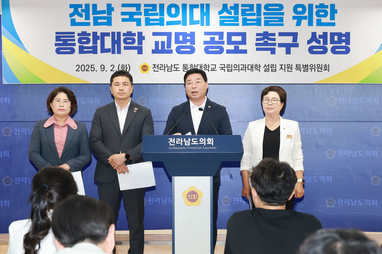[전남 세계타임즈=우덕현 기자] 전라남도 통합대학교 국립의과대학 설립 지원 특별위원회(이하 ‘의대 특위’)는 9월 2일 정부의 「의대 없는 지역에 의과대학 신설 추진」 국정과제 확정에 맞춰, 전남 의과대학 설립의 조속한 추진을 위해 국립목포대학교와 국립순천대학교의 통합대학 교명 공모를 강력히 촉구하는 성명서를 발표했다.