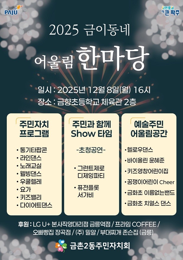 이미숙 금촌2동 주민자치회장은 “이번 어울림 한마당은 주민들이 직접 참여해 1년간의 활동 성과를 나누고, 서로를 응원하는 뜻깊은 자리”라며, “어린이부터 어르신까지 모두가 함께 어우러져 금촌2동 공동체의 생동감을 느낄 수 있는 의미 있는 시간이 되기를 바란다”라고 전했다.
