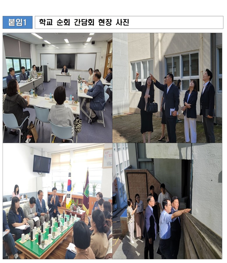 ◈ 운동장, 화장실, 강당 등 학교 기본 시설 현황 점검, 필요한 개선사항 청취 및 논의 [부산 세계타임즈=이용우 기자] 부산시의회 강철호 운영위원장은 그간 부산 동구 지역의 선출직으로선 처음으로 동구 수정초, 범일초, 경남여중, 부산중 등 초·중등학교 11개 학교를 대상으로 순회간담회를 실시하여 원도심 교육격차 해소와 지역 학교의 발전을 도모하였다. 이번 간담회는 지난 8월 26일 동구의회 회의실에서 개최한 11개 학교 학부모 대표 49명과 ‘아이키우기 좋은 도시 동구’ 정책수렴 토론회에서 논의된 현안을 교육현장에서 함께 풀어나가는 순회간담회로 9월 10일부터 9월 12일까지 3일간 진행되었다.