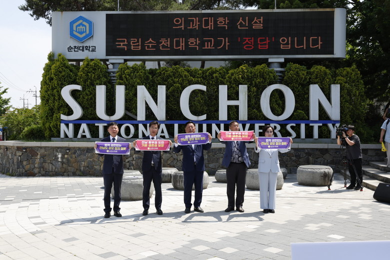 [순천시 세계타임즈=우덕현 기자] 전남 동부권 7개 시・군 의회(보성군의회, 고흥군의회, 구례군의회, 곡성군의회, 광양시의회, 순천시의회, 여수시의회)는 23일, 순천대학교 정문에 모여‘국립의과대학 순천 유치를 위한 공동성명서’를 발표했다.