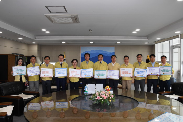광주시의회에 따르면 김동찬 의장을 비롯한 광주시의원들과 사무처 직원들은 28일, 코로나19 감염증 사태로 어려움을 겪고 있는 지역민들에게 희망의 메시지를 전하는 ‘코로나19 극복 희망 캠페인’을 실시했다.