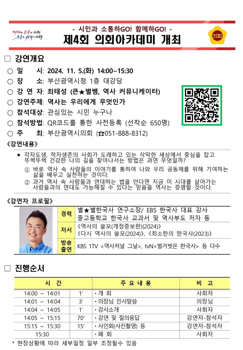 ◈ ‘역사는 우리에게 무엇인가’ 주제 강연으로 시민과 소통하는 열린의회 마련 [부산 세계타임즈=이용우 기자] 부산광역시의회(의장 안성민)는 11월 5일 오후 2시 부산시청 1층 대강당에서 최태성(큰★별쌤, 역사 커뮤니케이터) 강사를 초청하여‘제4회 의회아카데미’를 개최한다고 밝혔다.