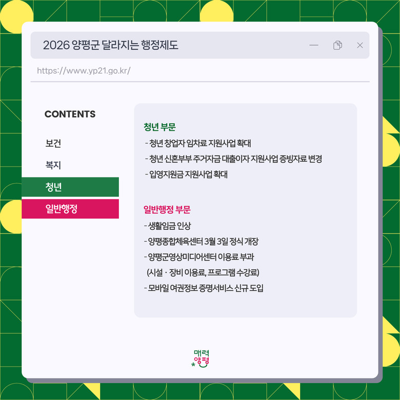 한편, ‘2026년 양평군 달라지는 행정제도 안내’에 대한 자세한 내용은 양평군 공식 블로그(https://m.blog.naver.com/yangpyeong63/224149019369)를 통해 확인할 수 있다.