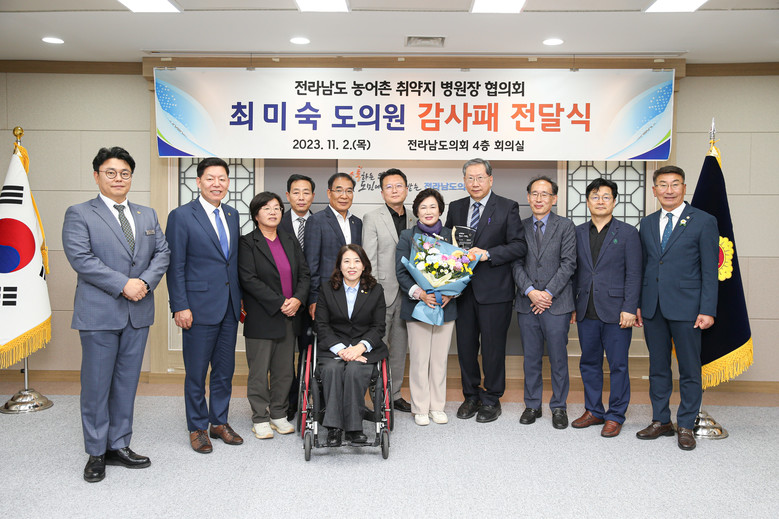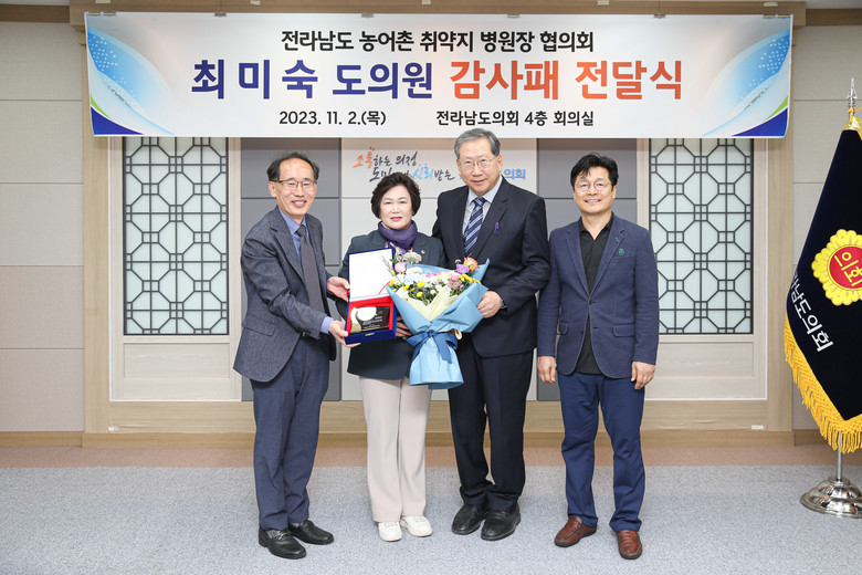[전남 세계타임즈=우덕현 기자] 전라남도의회 최미숙 의원(더불어민주당ㆍ신안2)은 11월 2일, 전라남도의회 4층 회의실에서 전라남도 농어촌취약지 병원장협의회로부터 감사패를 받았다.