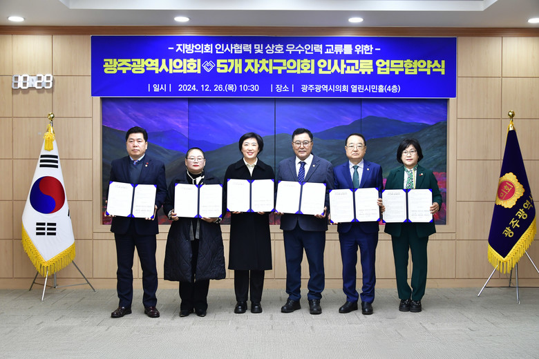이날 협약식에는 신수정 의장, 서용규 제1부의장, 채은지 제2부의장, 정다은 운영위원장, 문선화 동구의회의장, 전승일 서구의회의장, 남호현 남구의회의장, 최무송 북구의회의장, 김명수 광산구의회의장 등이 참석했다.