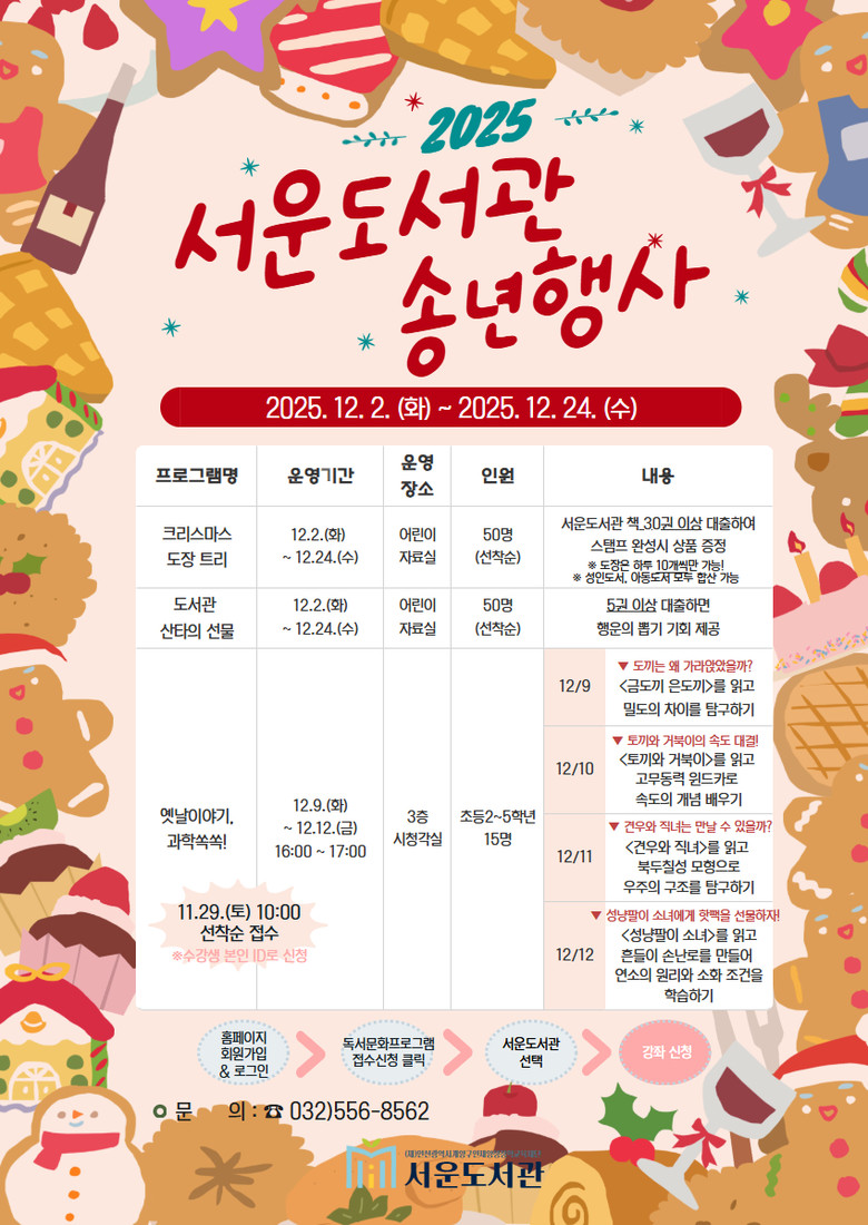- 대출 이벤트·과학특강 등 연말 맞이 문화 체험 확대 - [계양구 세계타임즈=심하린 기자] 인천 계양구 서운도서관(관장 권문혁)은 송년의 달을 맞아 어린이부터 성인까지 함께 즐길 수 있는 다양한 연말 프로그램을 운영한다고 밝혔다.
