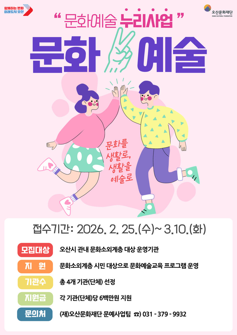 ‘2026 문화예술 누리사업’ 신청 및 접수에 관한 자세한 사항은 오산문화재단 홈페이지(www.osan.go.kr/arts) 또는 전화(☎ 031-379-9932)를 통해 확인할 수 있다.