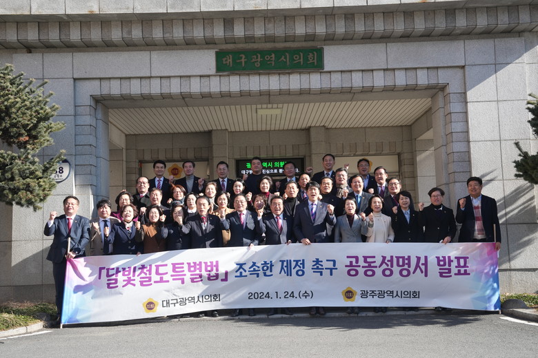 광주광역시의회(정무창 의장)와 대구광역시의회(이만규 의장) 의원들은 24일(수) 오후 2시 대구광역시의회에서 ‘달빛철도 특별법 조속한 제정’을 촉구하는 공동성명을 발표했다.