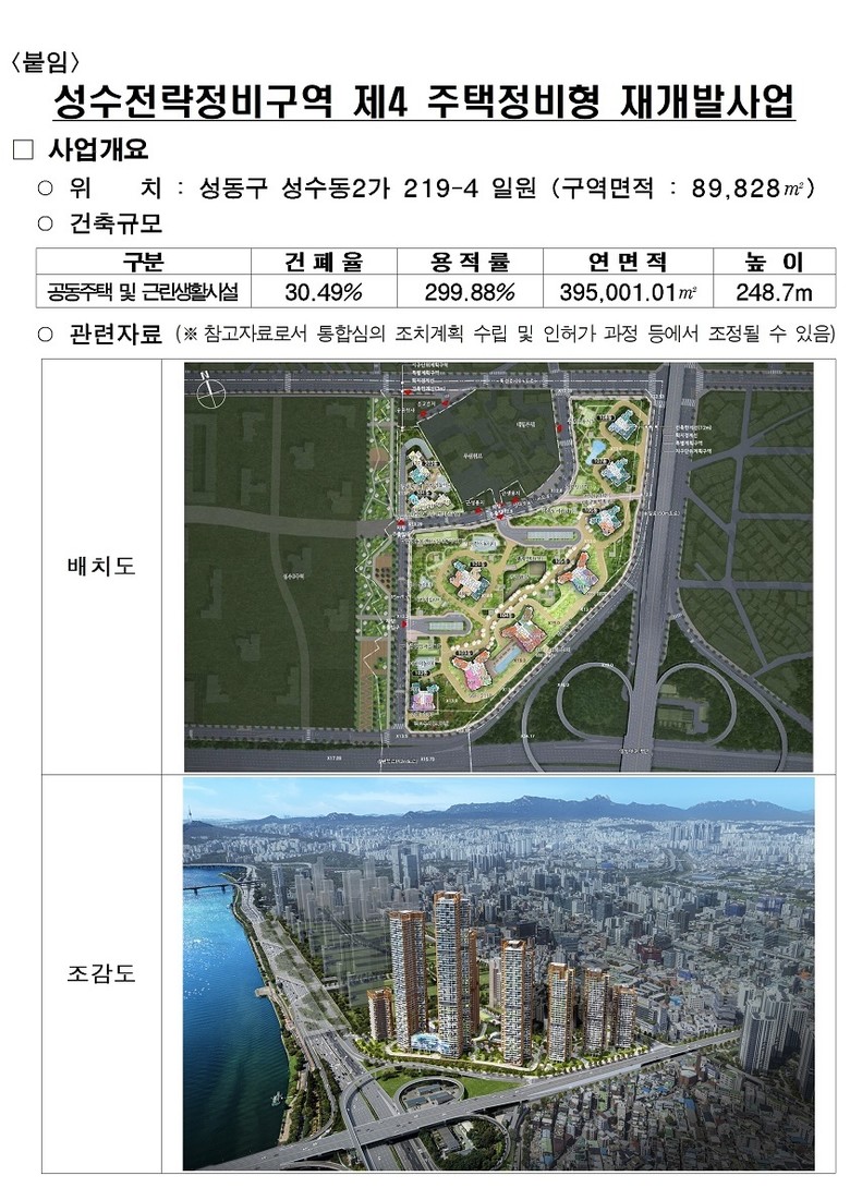 이번 통합심의를 통해 성수전략정비구역 4지구 재개발사업이 추진 속도를 내게 되었으며, 사업시행인가와 관리처분계획인가 절차를 신속히 진행해 2031년 착공할 예정이다.