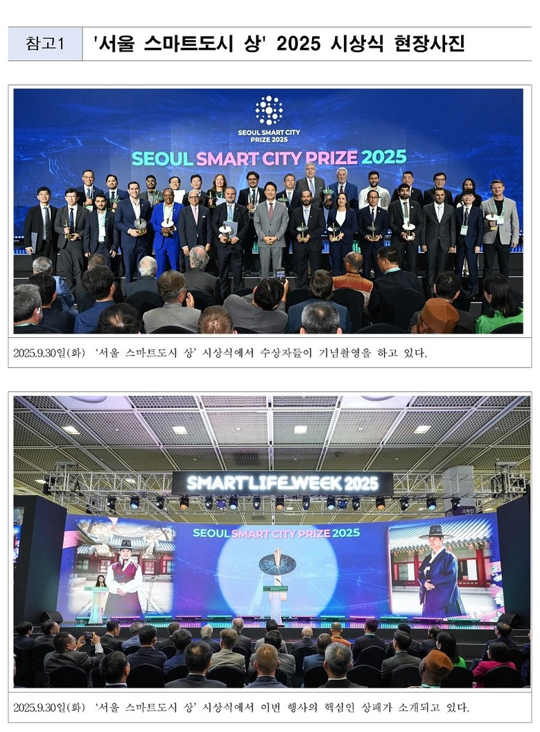 시상식은 세계 각국 도시 대표와 스마트도시 전문가, 학계 인사 등 300여 명이 참석해 우수 사례를 공유하는 국제 기술과 정책 교류의 장 ‘스마트라이프위크(SLW) 2026’과 연계해 10.6.(화) 코엑스(강남구 삼성동)에서 열릴 예정이다.