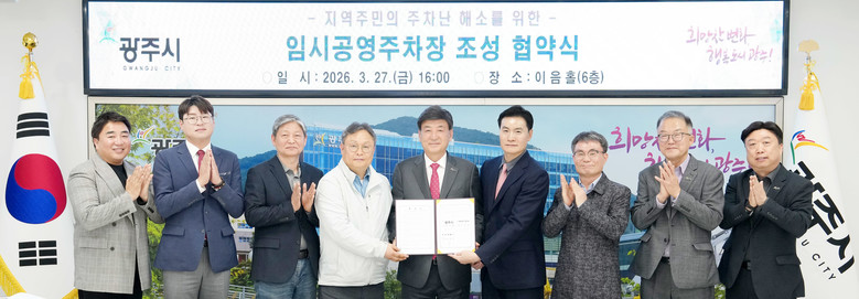 [광주시 세계타임즈=송민수 기자] 광주시는 고산동 산70-8 일원에 임시 공영주차장 조성을 위해 27일 ㈜해성디엔씨 및 고산개발㈜와 부지사용 협약을 체결했다.