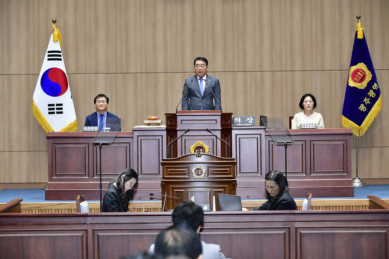 정무창 의장은 개회사를 통해 “이번 회기에는 시정질문을 비롯해 광주시와 교육청의 2023회계연도 결산 승인 등 안건을 처리할 예정이며, 9대 의회가 2년 남짓한 시간 동안 모든 의원께서 열성적으로 의정활동에 임해주셔서 5·18, 노동, 환경, 청년, 돌봄 등에서 의원들의 전문성을 바탕으로 가시적인 성과을 내었으며, 남은 2년도 마찬가지로 142만 광주시민을 대표하는 대의기관임을 잊지 않고 시민과 소통하는 의회, 일하는 의회로 만들어 갈 수 있도록 의원님 모두가 힘써주시길 바란다”고 밝혔다.