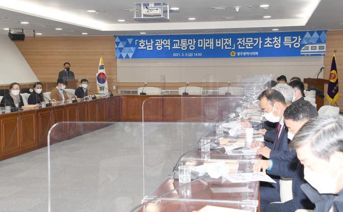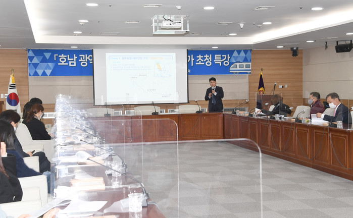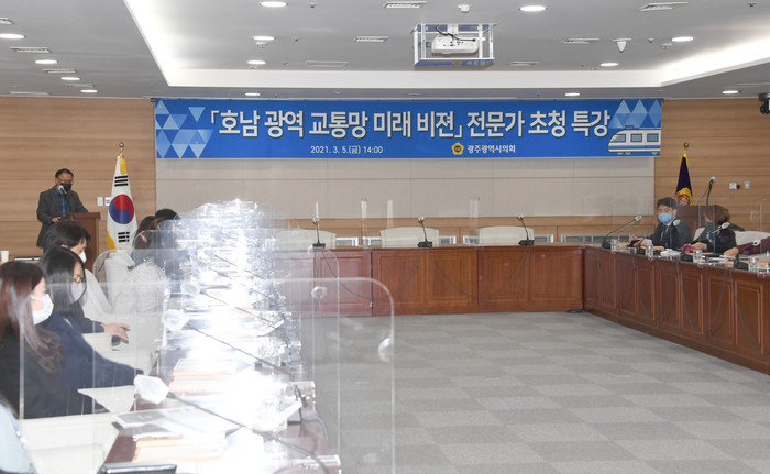 [광주=세계타임즈 손권일 기자] 광주광역시의회(김용집 의장)는 5일 김준하 광주과학기술원 대외협력처장(지구·환경공학부 교수)을 초청해 ‘호남권 광역교통망 구축을 통한 지역 미래비전 확보’를 주제로 특강을 가졌다.