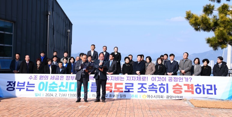 여수시의회는 광양시의회와 함께 2월 7일 묘도동 이순신대교 홍보관에서 ‘이순신대교 국도 승격 촉구 성명서’를 발표했다.