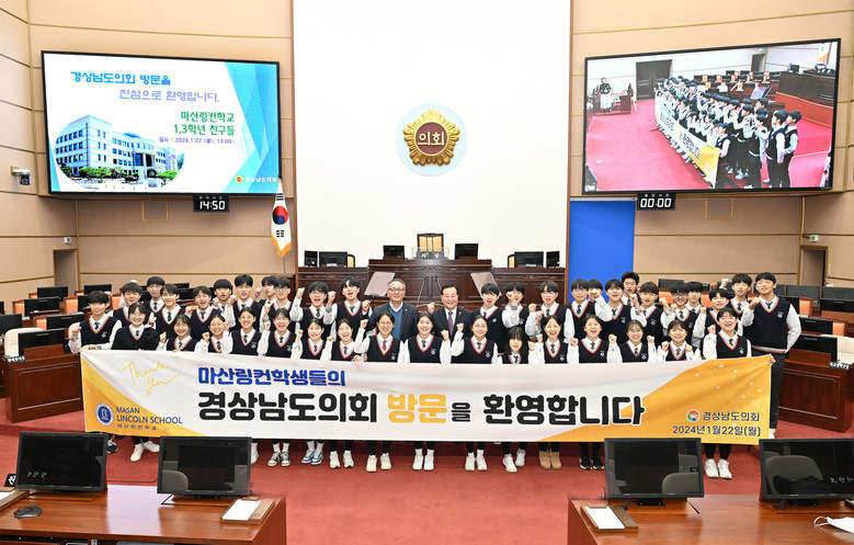 이날 행사에는 링컨하우스마산스쿨 학생 및 교사 약 50여명이 참석해 경상남도의회의 역사와 의회의 기능 및 구성에 대해 견학하고 질의 및 문답하는 시간을 가졌다.