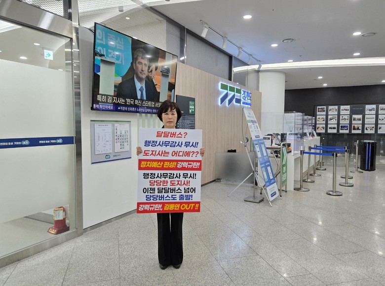 이채영 의원은 ‘달달버스? 행정사무감사 무시! 도지사는 어디에? 정치예산 편성! 강력규탄!’ 등의 문구가 적힌 피켓을 들고 도정의 책임 회피를 강하게 비판하며 규탄의 뜻을 밝혔다.
