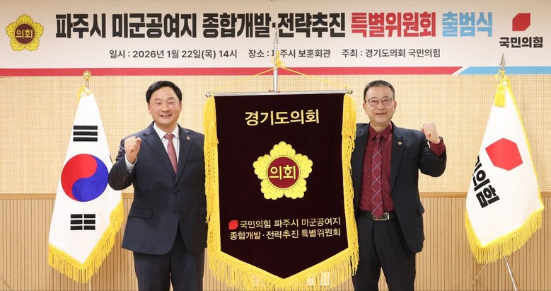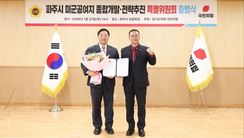 [경기도 세계타임즈=송민수 기자] 경기도의회 국민의힘(대표의원 백현종)은 22일 ‘파주시 미군공여지 종합개발·전략추진 특별위원회’를 출범하고 특별위원장에 고준호(파주1) 의원을 임명했다.