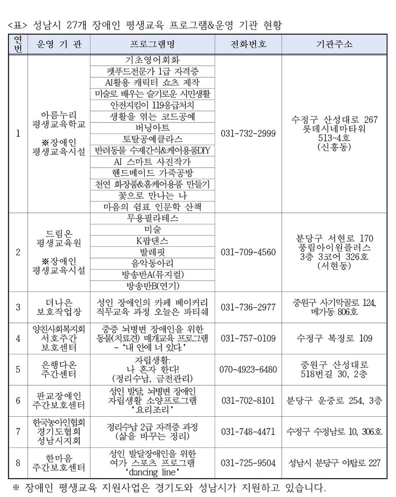 이들 프로그램은 장애인 평생교육시설인 아름누리 평생교육학교(수정구 신흥동), 드림온 평생교육원(분당구 서현동), 더나은 보호작업장(중원구 상대원동) 등 8곳에서 운영된다.