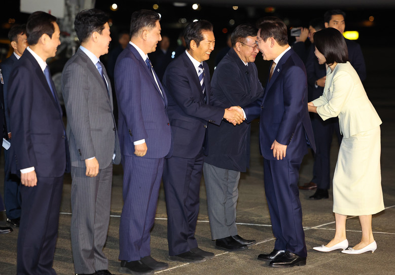 [세계타임즈 = 이채봉 기자] 한-아세안 정상회의를 마친 이재명 대통령과 부인 김혜경 여사가 27일 경기 성남 서울공항에 도착해 공군1호기에서 내려 민주당 정청래 대표와 인사하고 있다. 2025.10.27
