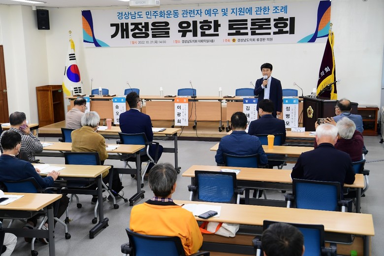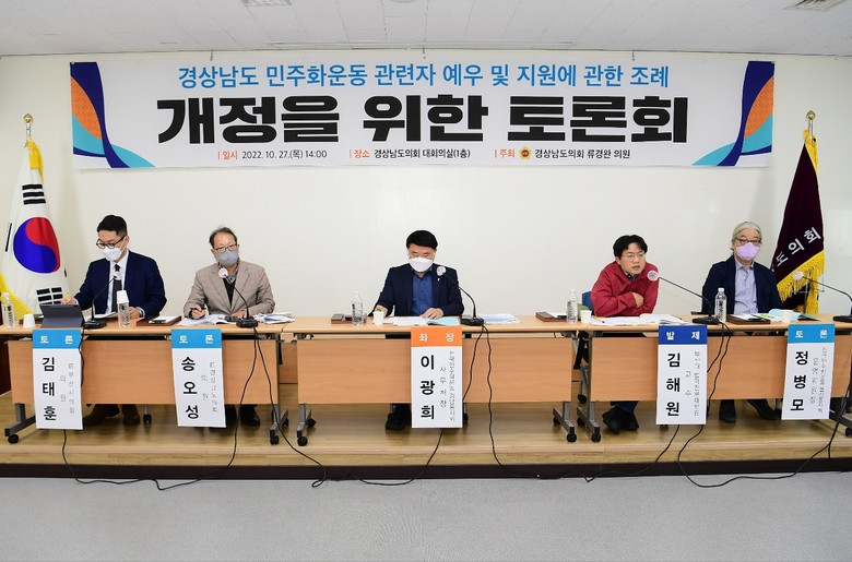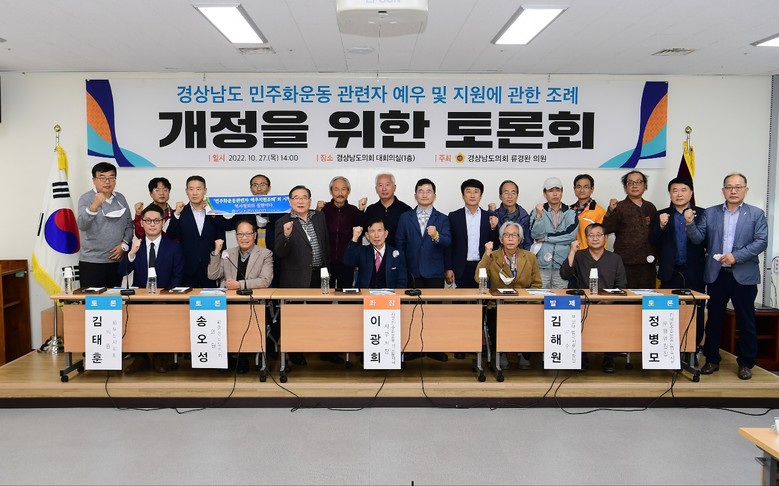 [경남 세계타임즈=최성룡 기자] 류경완 경남도의원(민주당, 남해)은 27일 도의회 대회의실에서 ‘경상남도 민주화운동 관련자 예우 및 지원에 관한 조례 개정을 위한 토론회’를 개최했다.