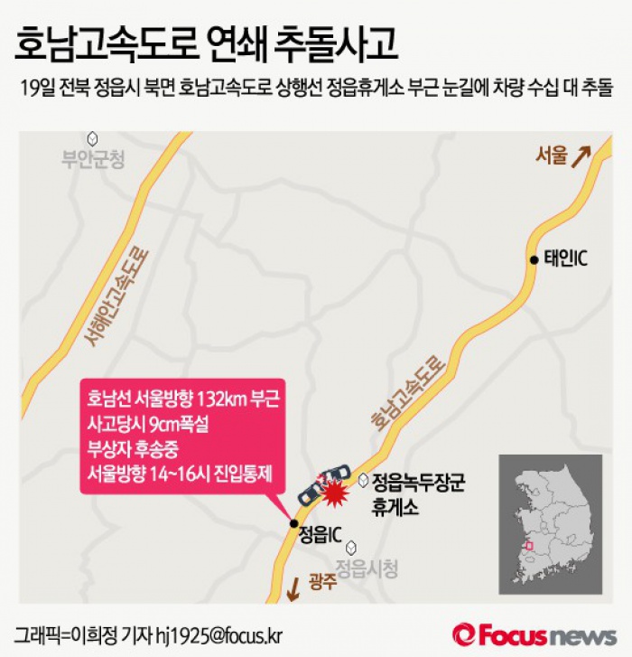 (서울=포커스뉴스) 19일 전북 정읍시 북면 호남고속도로 상행선 정읍휴게소 부근에서 차량 수십대가 추돌했다.