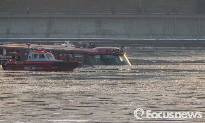 (서울=포커스뉴스) 26일 오후 서울 한강 영동대교 인근을 지나던 한강유람선이 침수, 구조대원들이 구조활동과 견인 작업을 하고 있다.
