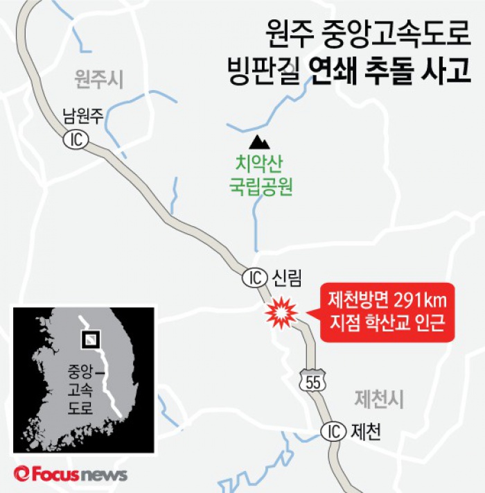 (서울=포커스뉴스) 16일 오후 5시 25분쯤 강원도 원주시 신림면 중앙고속도로 원주~제천 구간 신림IC에서 제천방면 291㎞ 지점에서 차량 35대가 연쇄 추돌하는 사고가 발생했다.