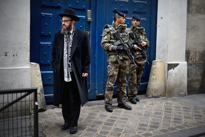 파리 마레지구 유대인 구역의 한 학교 외곽에서 무장 군인들이 경계근무를 하고 있다.(Photo by Jeff J Mitchell/Getty Images)