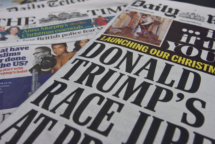 지난해 12월 9일자 영국 신문들의 1면. "런던경찰이 특정한 무슬림 구역을 순찰하는 것을 겁낸다"는 트럼프의 발언을 일제히 보도하고 있다.(Photo by Ben Pruchnie/Getty Images)