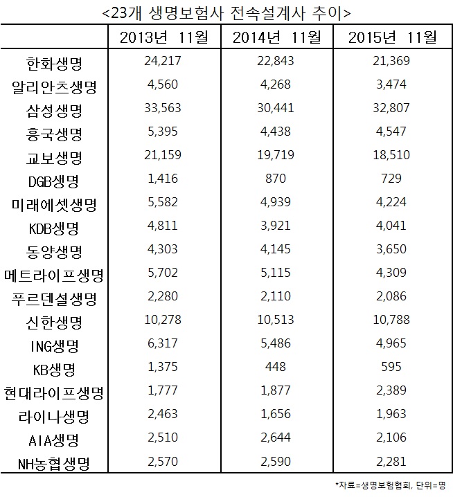 생보사의 전속 보험설계사 수는 최근 3년 간 지속적으로 줄어들었다. 생명보험협회가 23개 생보사를 대상으로 수집한 자료에 따르면 2013년 11월말 23개 생보사의 전속 설계사 수는 14만6595명 수준에서, 2014년 11월말 13만3061명, 2015년 11월말 12만9846명으로 줄어들었다. 2013년과 2015년을 비교하면 무려 11%가량(1만6749명) 줄어들었다.