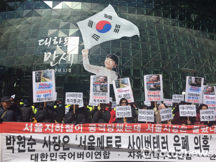 한편 하 의원은 지난 9일 YTN라디오 '신율의 출발 새아침'과 인터뷰에서 "서울메트로는 지난 2014년 7월쯤 북한으로부터 집중적인 해킹을 받았고 박 시장은 국정감사장에서 이 부분에 대해 보고를 받은 적이 없다고 답변했다"고 말했다.대한민국어버이연합 등 3개 보수단체는 10일 오후 2시 서울광장에서 '서울메트로 사이버테러 은폐 의혹 진실규명 촉구' 집회를 열고 피켓시위를 펼쳤다. 2016.03.10. 유경아 기자 yooka@focus.co.kr