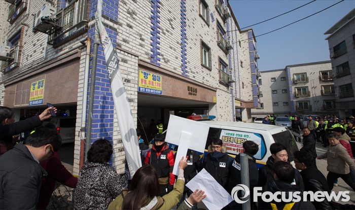 (평택=포커스뉴스) 학대와 무관심 속에 살해당한 신원영 군의 계모 김모 씨와 친부 신모 씨가 14일 오후 경기도 평택시 포승읍 자택에 도착, 기다리던 시민단체 회원들과 시민들이 살인죄 적용을 촉구하는 구호를 외치고 있다.