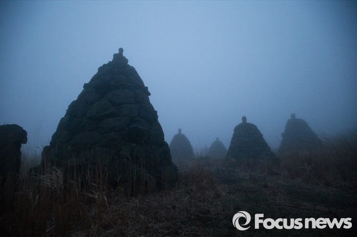 (제주=포커스뉴스) 안개 낀 18일 오후 제주시 남조로 돌문화공원에 마을의 무사안녕을 기원하는 방사탑들이 놓여져 있다.