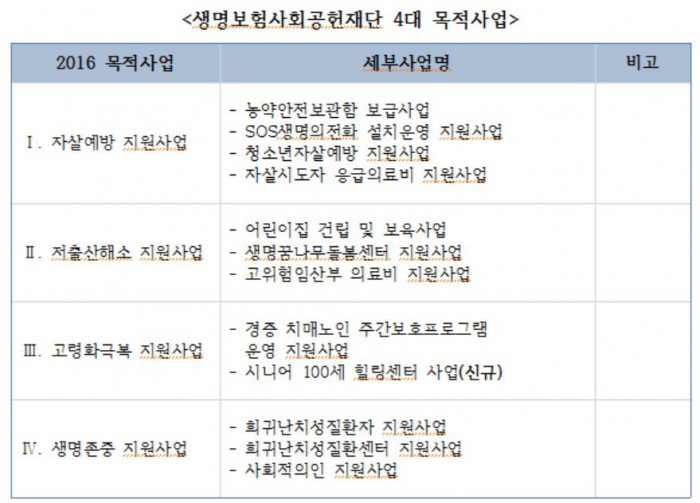 이 재단은 작년 진행한 7대 목적사업을 자살예방 지원사업, 저출산해소 지원사업, 고령화극복 지원사업, 생명존중 지원사업 등 4대 목적사업으로 개편한다.