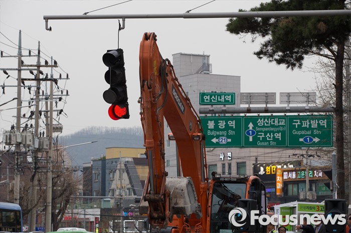 포크레인에 걸려 고장난 신호등